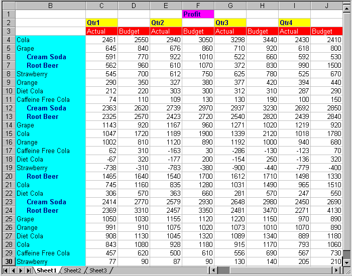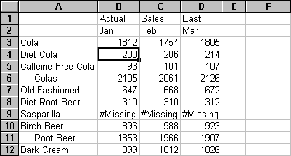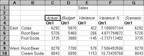 In Asymm.xls, row and column dimension groups are asymmetric. Thus, the nested member groups from the Product dimension differ in member content within respective markets. For example, Colas and Fruit Soda are included in East but not in West. In addition, Actual data is displayed for Qtr1, whereas Budget data is displayed for Qtr2, Qtr3, and Qtr4. Also notice that the sample file displays styles for members of the Scenario and Year dimensions.