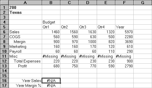 Now define a free-form report that does not contain all of the dimensions from the database. In Advanced Interpretation mode, you may need to enter a dummy data value, such as 0, into the first Essbase data cell to tell Essbase where the data starts in the worksheet. Be sure to use a numeric value as the dummy value.
